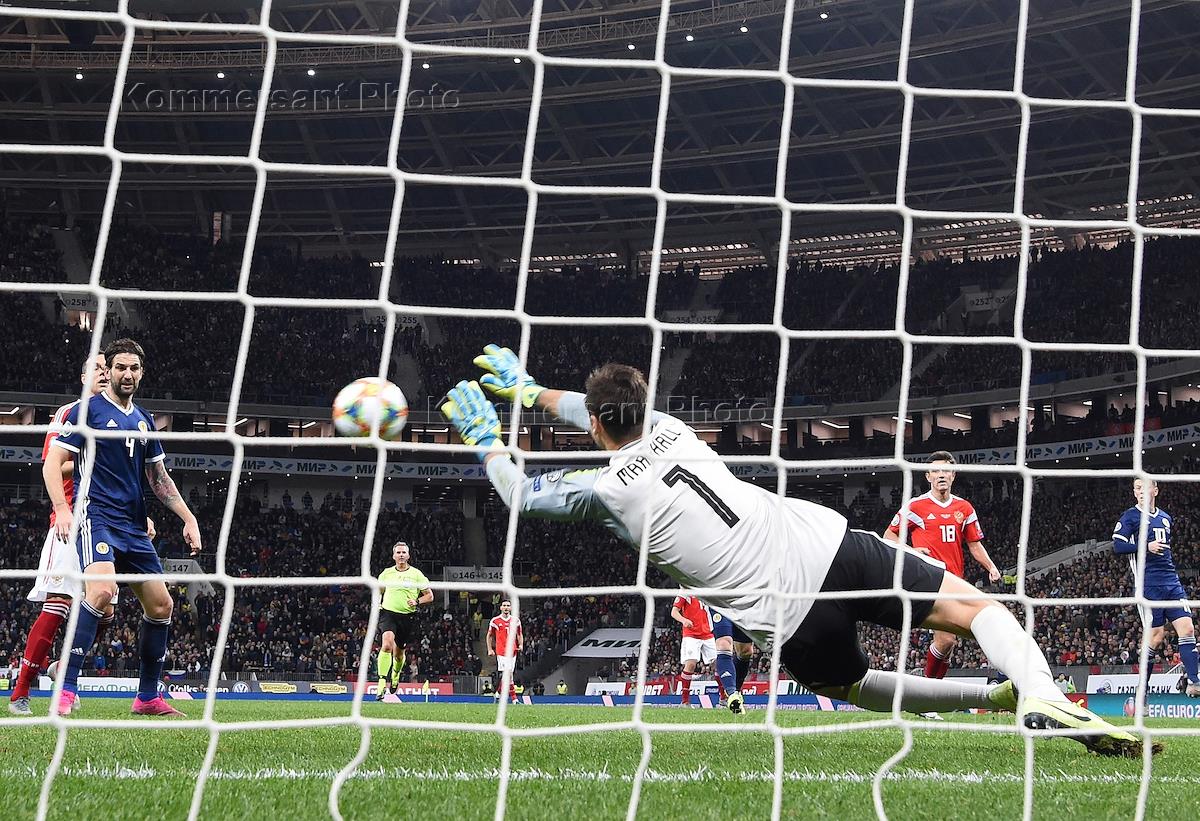 Отборочный матч Чемпионата Европы по футболу 2020 между сборными командами России и Шотландии на стадионе "Лужники". Вратарь сборной России Маринато Гильерме во время матча.