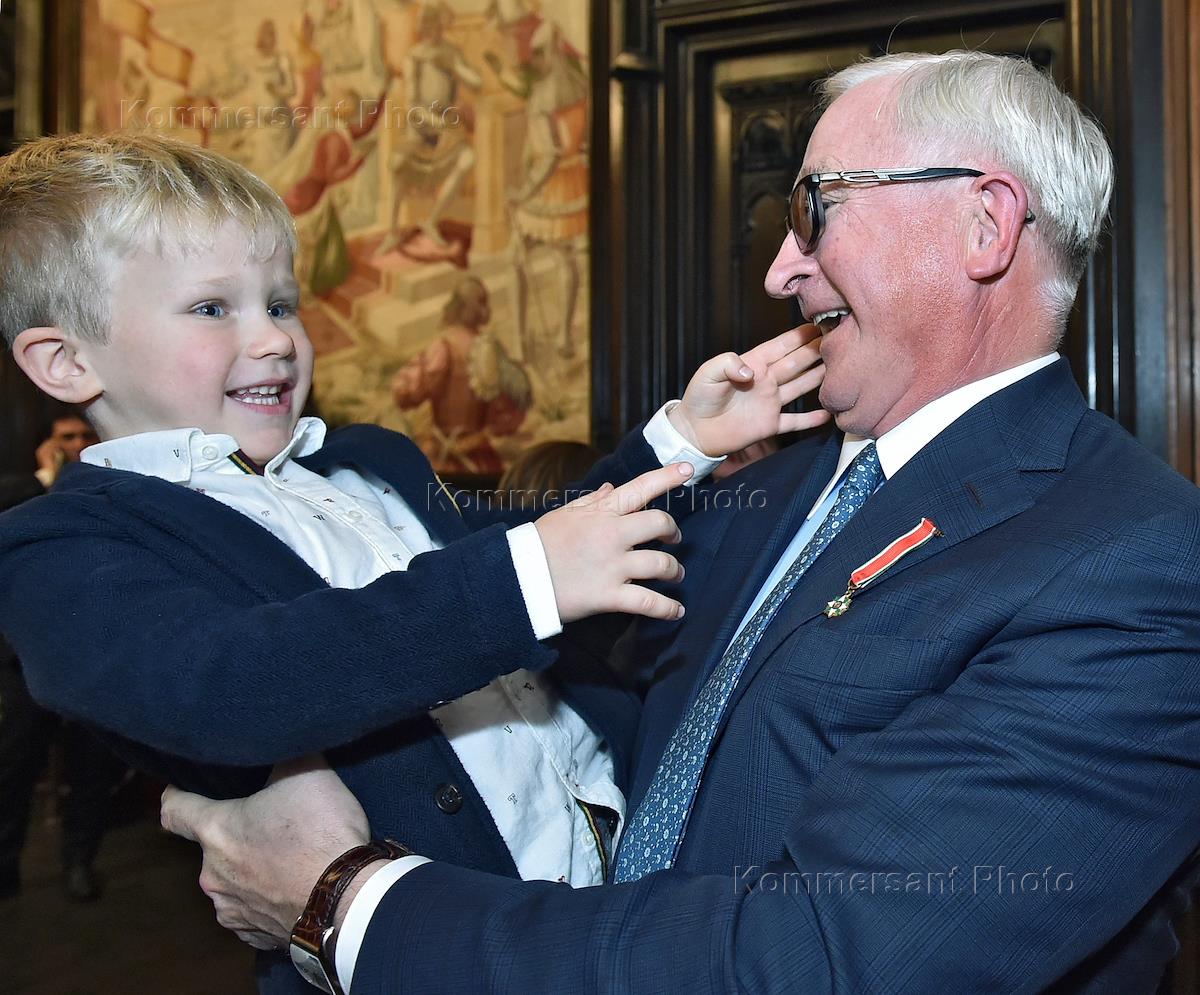 Order of Cavalier awarding ceremony for President of the Russian Union of Industrialists and Entrepreneurs (RSPP) Alexander Shokhin at the Italian Embassy. Director of the Emergency Surgery & Children's Trauma Department of Moscow's Pediatric Scientific Research Institute Leonid Roshal (left) and daughter of Alexander Shokhin, president of the RSPP Business School Evgenia Shokhina (right) at the ceremony.