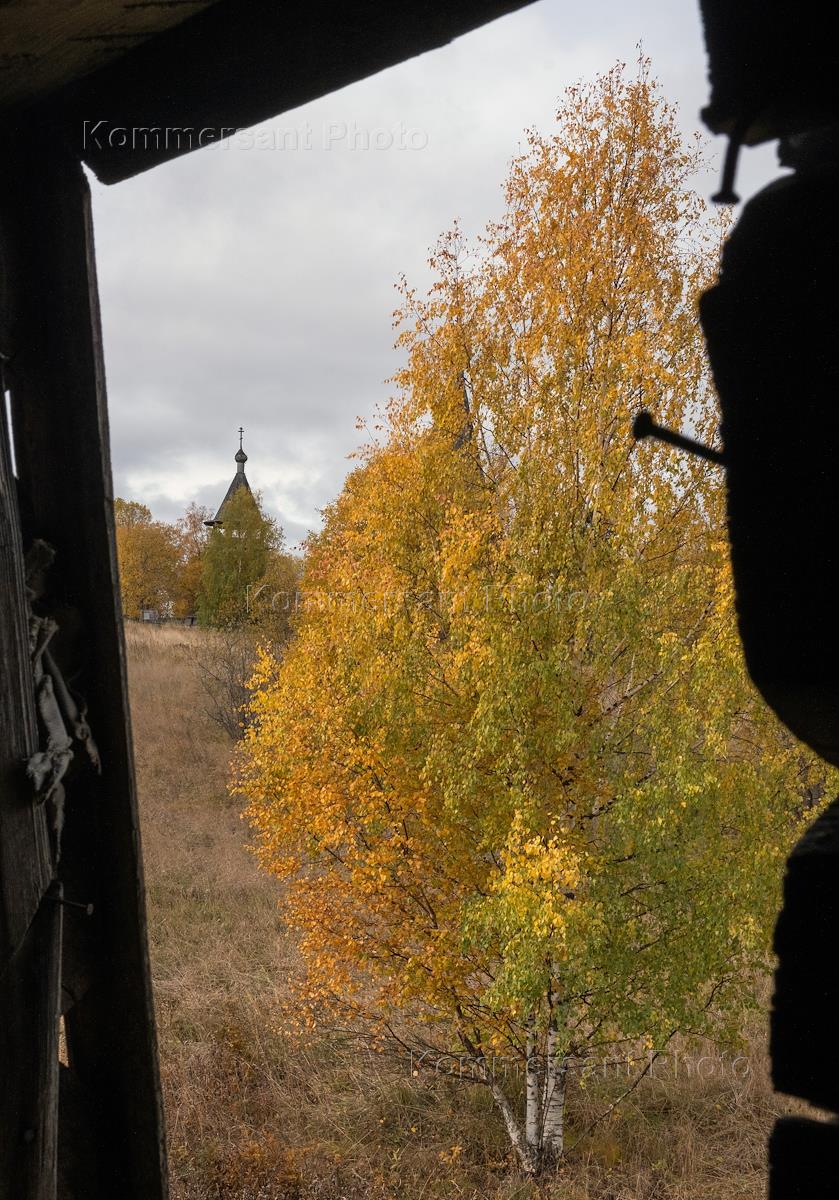 Вид на Церковь Рождества Богородицы Гиморецкого погоста из окна заброшенной избы.