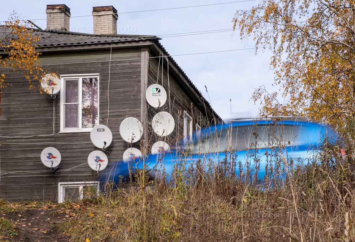 Жанровая фотография. Деревянный дом со спутникавыми телевизионными антеннами.