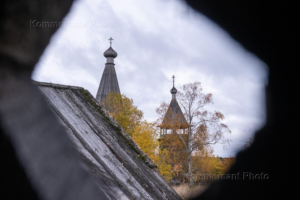 Вид на церковь Рождества Богородицы Гиморецкого погоста из ставень заброшенной избы в деревне Гимрека.