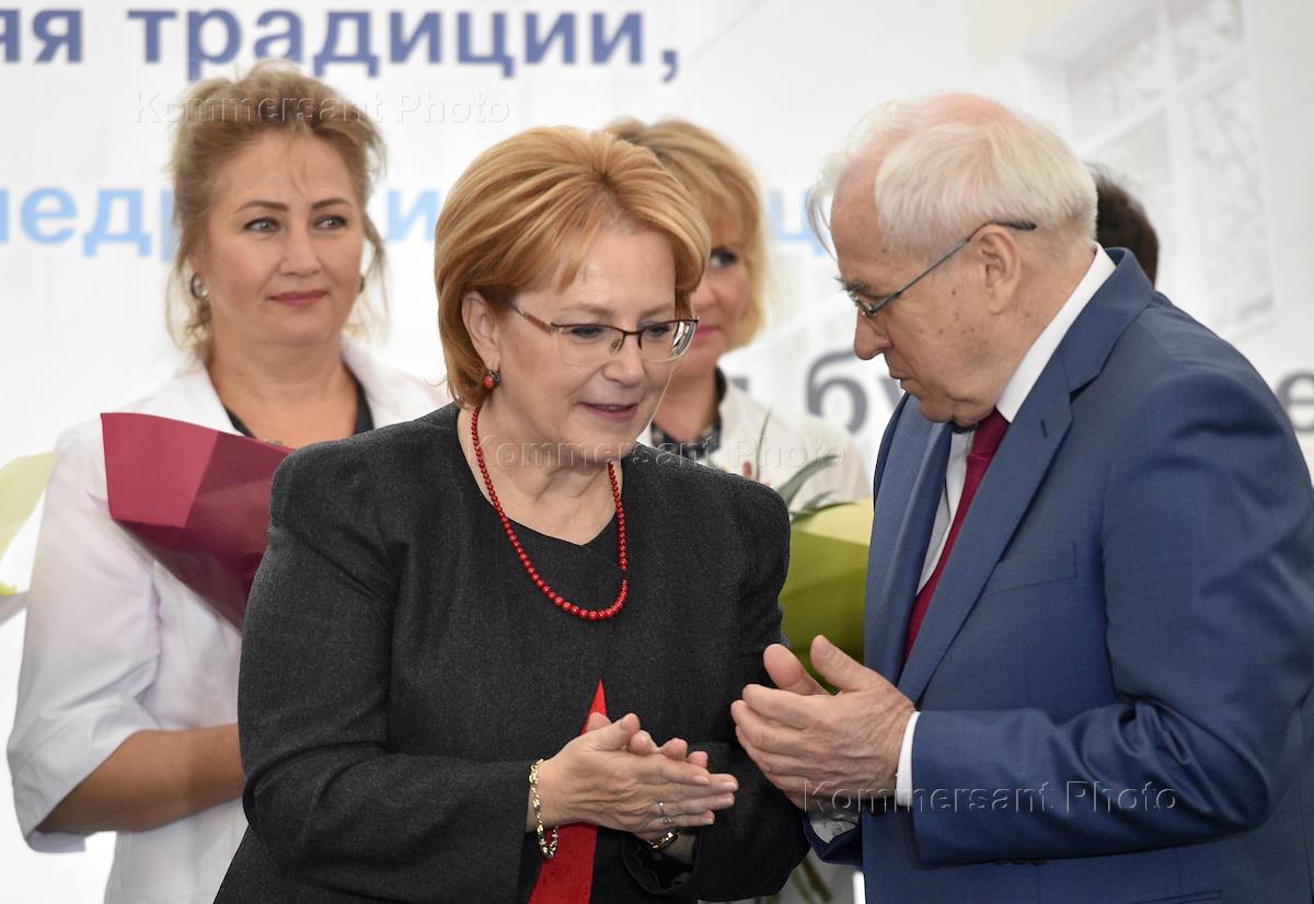 Церемония официального открытия нового корпуса ФГБУ "ГНЦК имени А.Н. Рыжих" Министерства здравоохранения России. Министр здравоохранения России Вероника Скворцова (слева) на церемонии.