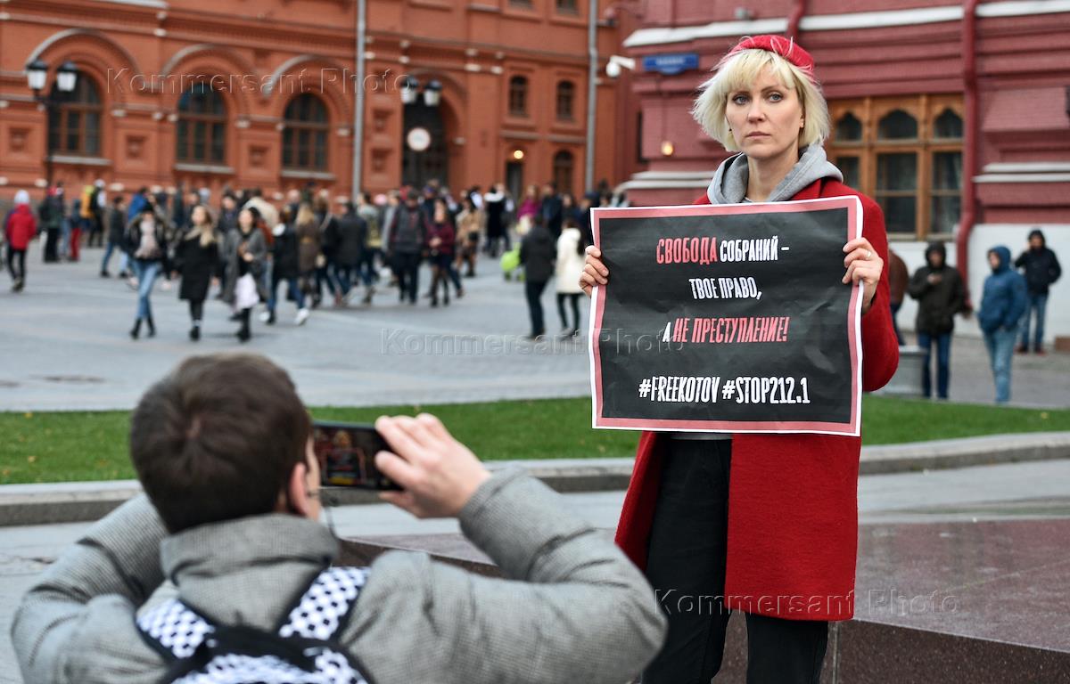 Одиночные пикеты в поддержку Константина Котова, обвиняемого в неоднократном нарушение правил проведения митинга. Участница пикета у памятника маршалу Георгию Жукову на Манежной площади.