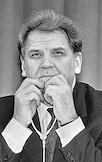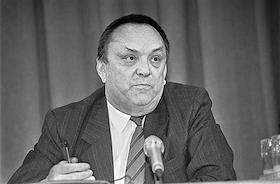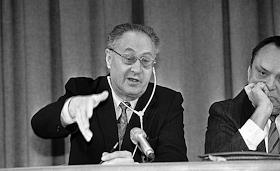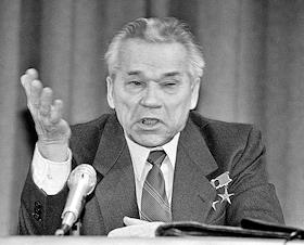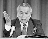 Конструктор стрелкового оружия Михаил Калашников во время пресс-конференции.