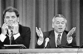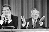 Конструктор стрелкового оружия Михаил Калашников (справа) во время пресс-конференции.
