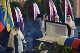 Церемония прощания с летчиком-космонавтом Алексеем Леоновым на Федеральном военно-мемориальном кладбище в Мытищах. Слева направо: летчик-космонавт Борис Волынов с супругой Тамарой Волыновой, заместитель председателя комитета Государственной думы России по федеративному устройству и вопросам местного самоуправления, первая женщина космонавт Валентина Терешкова и министр обороны России Сергей Шойгу во время церемонии.