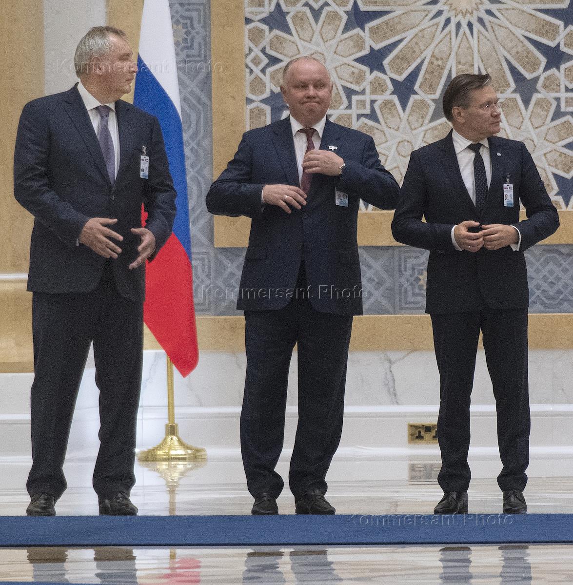 Рабочая поездка президента России Владимира Путина в Объединенные Арабские Эмираты (ОАЭ). Переговоры президента России Владимира Путина с наследным принцем Абу-Даби, заместителем Верховного главнокомандующего вооруженными силами ОАЭ Мухаммедом бен Заидом Аль Нахайяном состоялись во дворце Каср аль-Ватан. Слева направо: генеральный директор Государственной корпорации по космической деятельности "Роскосмос" Дмитрий Рогозин, генеральный директор ОАО "Рособоронэкспорт" Александр Михеев и генеральный директор госкорпорации "Росатом" Алексей Лихачев перед началом переговоров.