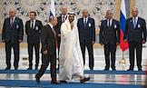 Рабочая поездка президента России Владимира Путина в Объединенные Арабские Эмираты (ОАЭ). Переговоры президента России Владимира Путина с наследным принцем Абу-Даби, заместителем Верховного главнокомандующего вооруженными силами ОАЭ Мухаммедом бен Заидом Аль Нахайяном состоялись во дворце Каср аль-Ватан. Слева направо: наследный принц Абу-Даби, заместитель верховного главнокомандующего вооруженными силами ОАЭ Мухаммед бен Заид Аль Нахайян, генеральный директор Государственной корпорации по космической деятельности "Роскосмос" Дмитрий Рогозин, президент России Владимир Путин и справа налево:генеральный директор госкорпорации "Росатом" Алексей Лихачев и генеральный директор ОАО "Рособоронэкспорт" Александр Михеев во время церемонии официальной встречи.