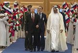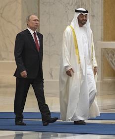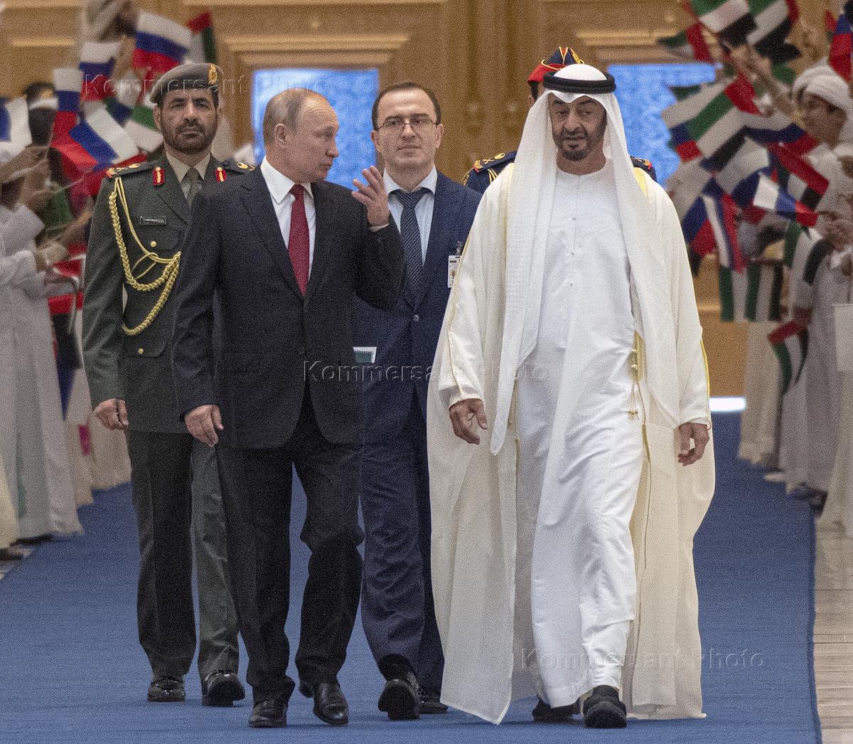 Рабочая поездка президента России Владимира Путина в Объединенные Арабские Эмираты (ОАЭ). Переговоры президента России Владимира Путина с наследным принцем Абу-Даби, заместителем Верховного главнокомандующего вооруженными силами ОАЭ Мухаммедом бен Заидом Аль Нахайяном состоялись во дворце Каср аль-Ватан. Президент России Владимир Путин (в центре) и наследный принц Абу-Даби, заместитель верховного главнокомандующего вооруженными силами ОАЭ Мухаммед бен Заид Аль Нахайян (справа) на церемонии официальной встречи.