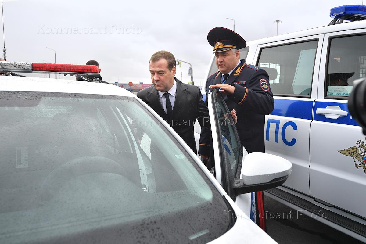 Рабочая поездка председателя правительства России Дмитрия Медведева в Екатеринбург. Председатель правительства России Дмитрий Медведев (слева) и начальник Главного управления по обеспечению безопасности дорожного движения (ГУОБДД) МВД России Михаил Черников (справа) во время осмотра экспозиции Международной специализированной выставки "Дорога-2019".