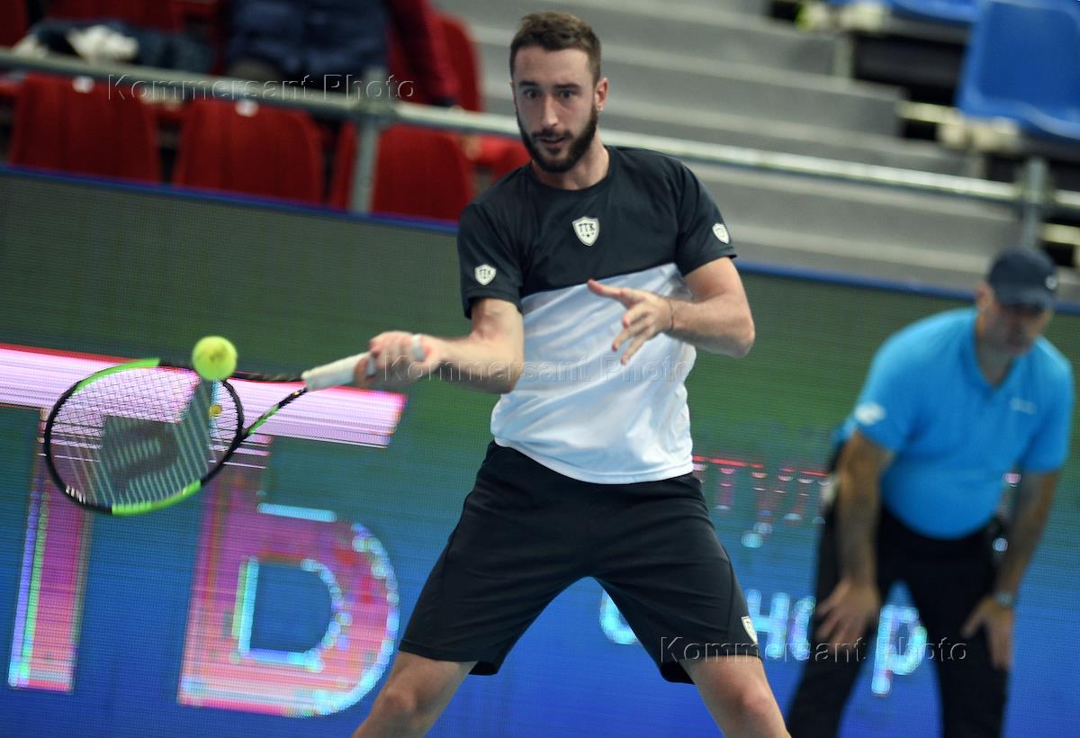 XXX Международный теннисный турнир "ВТБ Кубок Кремля" в ледовом дворце "Крылатское". Белорусский теннисист Егор Герасимов во время матча с белорусским теннисистом Андреем Рублевым.