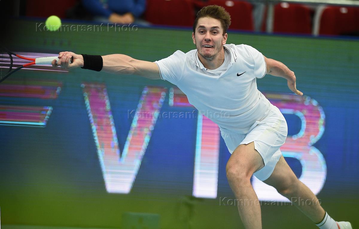 XXX Международный теннисный турнир "ВТБ Кубок Кремля" в ледовом дворце "Крылатское". Белорусский теннисист Егор Герасимов во время матча с белорусским теннисистом Андреем Рублевым.