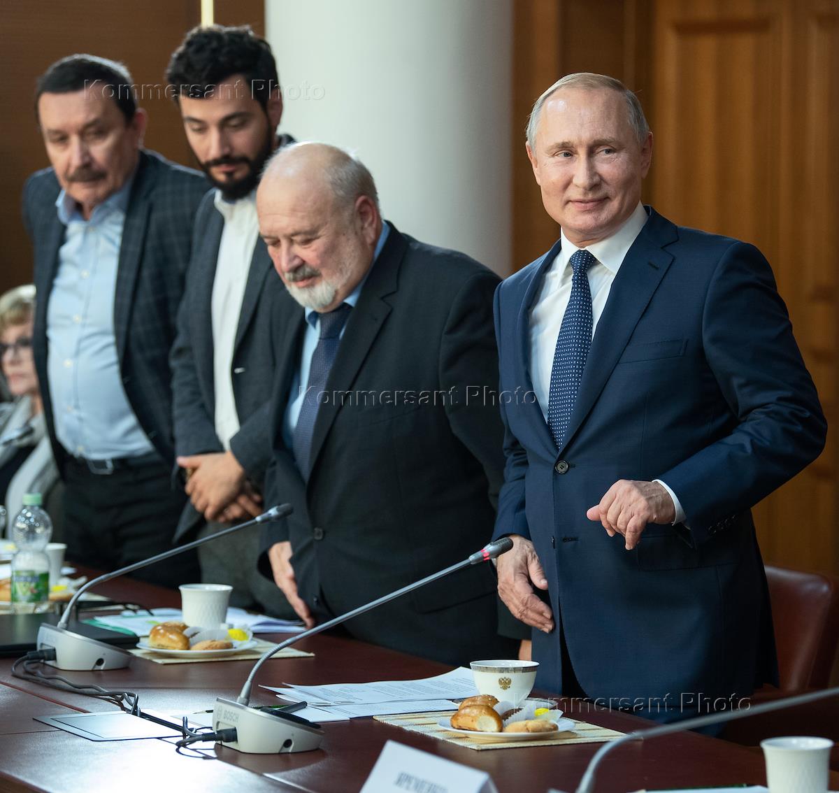 Встреча президента России Владимира Путина с мастерами, молодыми выпускниками и студентами Всероссийского государственного института кинематографии им. С.А. Герасимова (ВГИК). Слева направо: министр культуры России Владимир Мединский, советник президента России по культуре Владимир Толстой и продюсер Ренат Давлетьяров во время встречи.
