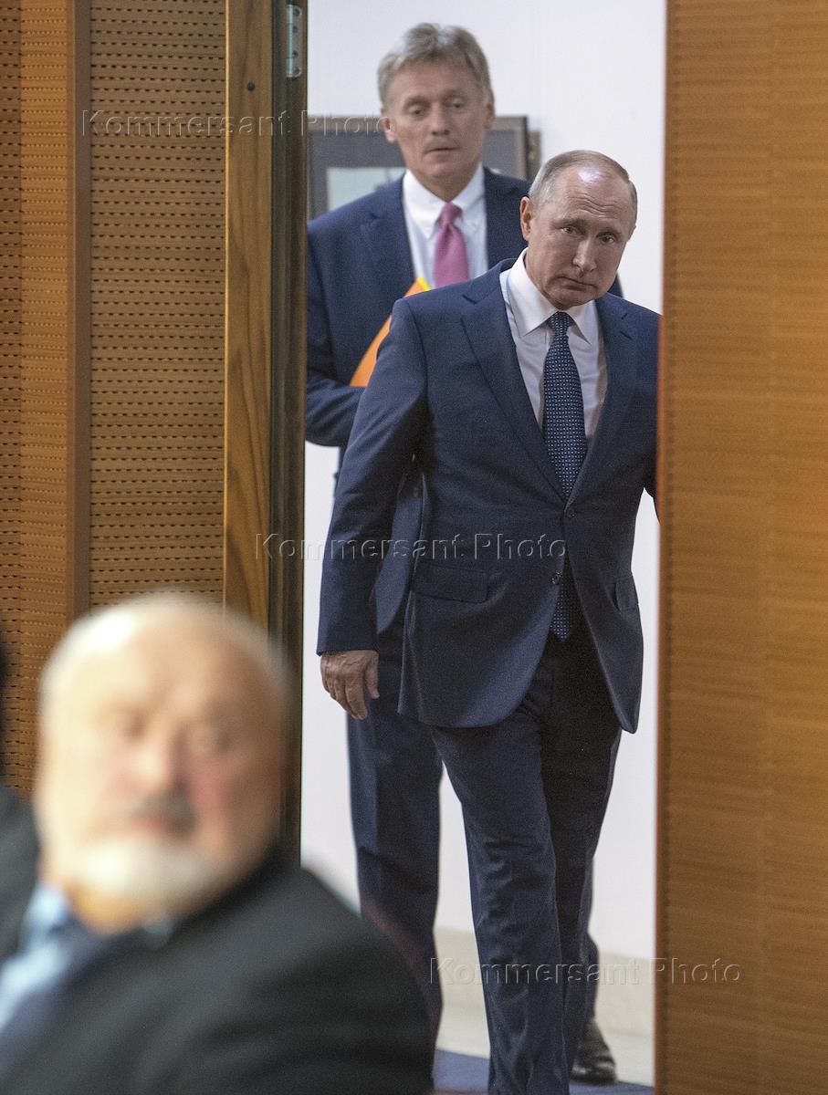 Президент России Владимир Путин (справа) и заместитель руководителя администрации президента России, пресс-секретарь президента Дмитрий Песков во время встречи с мастерами, молодыми выпускниками и студентами Всероссийского государственного института кинематографии им. С.А. Герасимова (ВГИК).