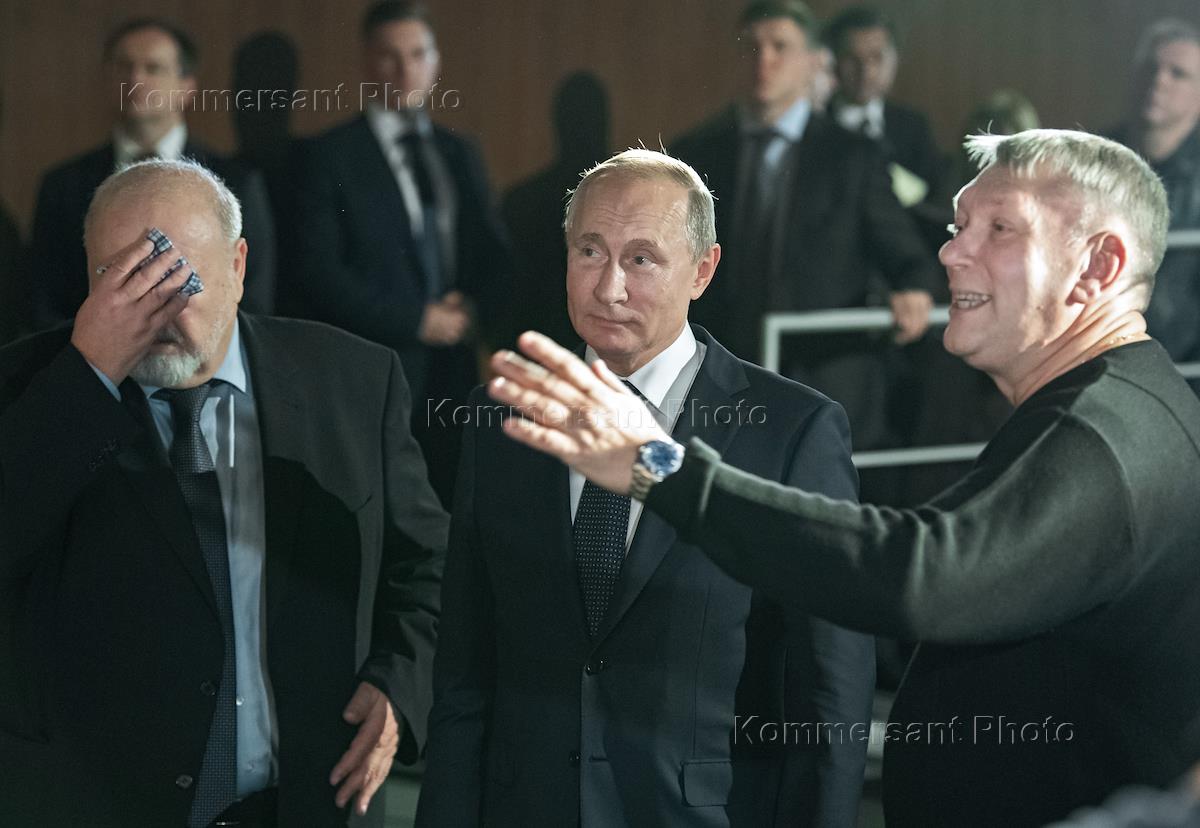 Russian President Vladimir Putin (right), Gerasimov Institute of Cinematography (VGIK) rector Vladimir Malyshev (center) and Advisor to the President of Russia on Cultural issues Vladimir Tolstoy (left) during a meeting with VGIK students.