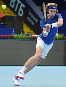 XXX Международный теннисный турнир "ВТБ Кубок Кремля" в ледовом дворце "Крылатское". Российский теннисист Андрей Рублев во время полуфинального матча одиночного разряда среди мужчин против хорватского теннисиста Марина Чилича.