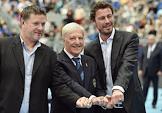 XXX Международный теннисный турнир "ВТБ Кубок Кремля" в ледовом дворце "Крылатское". Цремония вручения именных перстней членам Международного зала теннисной славы Марату Сафину и Евгению Кафельникову. Слева направо: вице-президент Федерации тенниса России (ФТР) Евгений Кафельников, чешский теннисист и трехкратный победитель турниров "Большого шлема" Ян Кодеш и российский теннисист Марат Сафин во время церемонии.