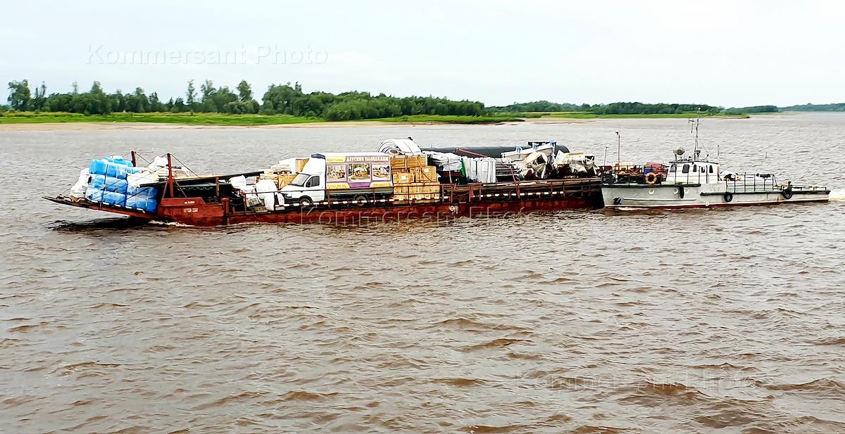 Речной порт на берегу реки Обь. Портовые краны грузят щебень в железнодорожные вагоны.