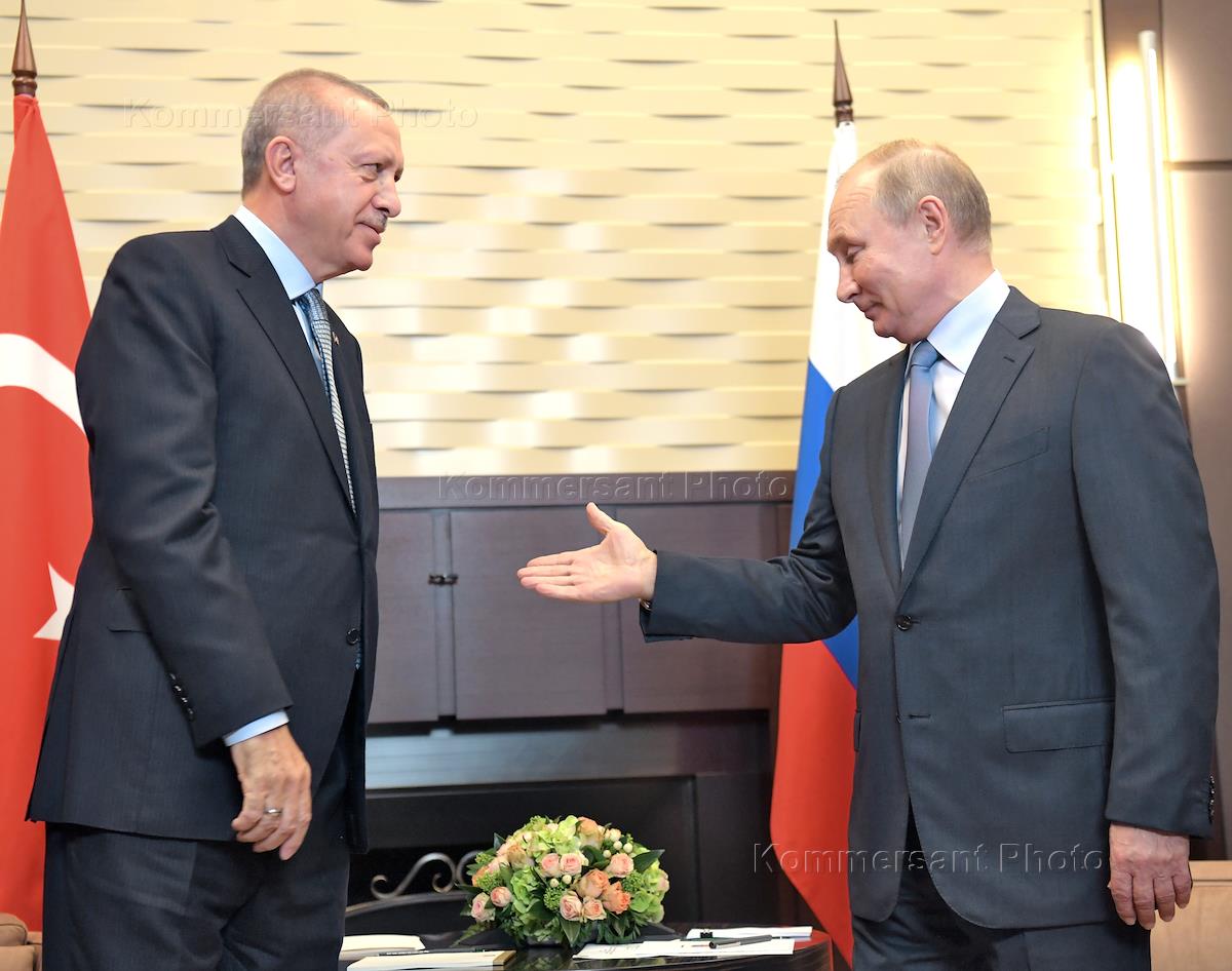 Рабочая поездка президента России Владимира Путина в Сочи. Президент России Владимир Путин (справа) и президент Турции Реджеп Тайип Эрдоган (слева) во время встречи по вопросам сирийского урегулирования. Встреча прошла в резиденции "Бочаров ручей".