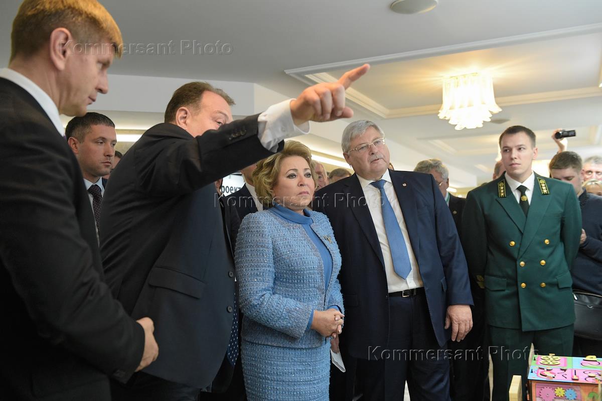 Заседание Совета Федерации (СФ) России. Председатель СФ России Валентина Матвиенко (в центре) и губернатор Томской области Сергей Жвачкин (второй справа) перед началом заседания.