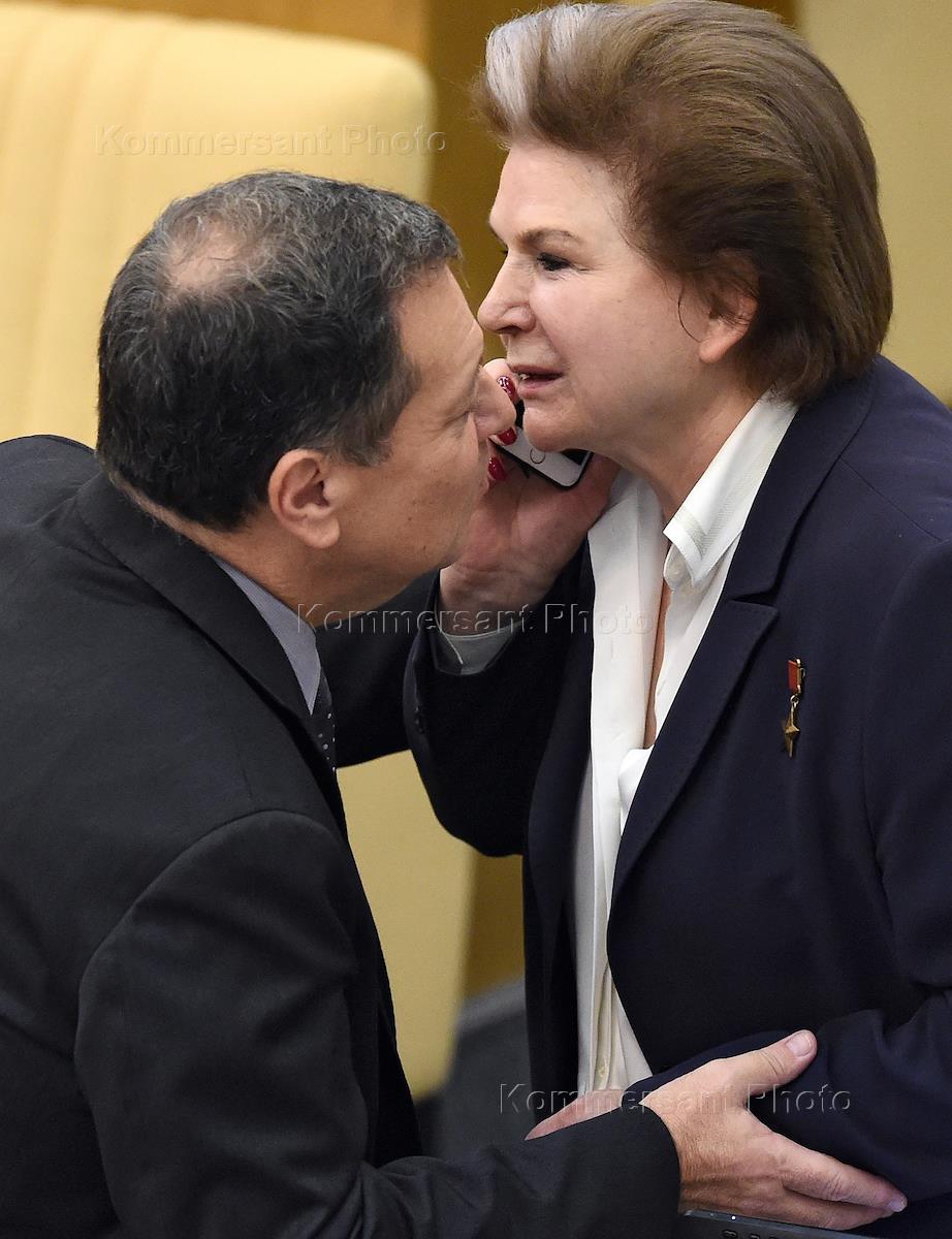Пленарное заседание Государственной думы (ГД) России. Заместитель председателя комитета ГД России по федеративному устройству и вопросам местного самоуправления Валентина Терешкова (справа) и председатель комитета ГД России по бюджету и налогам Андрей Макаров (слева) перед началом заседания.