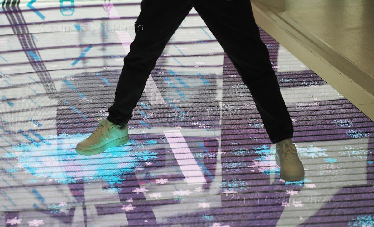 VIII International Forum "Open Innovations 2019". Startup Expo exhibition in Amalthea Business Center at the Skolkovo Innovation Center. Genre photo. Red socks, shoes without laces.