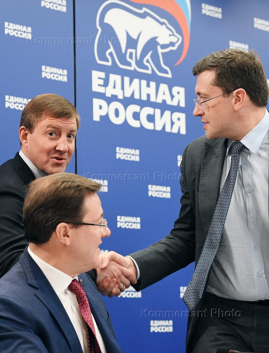 Встреча председателя правительства России, председатель партии "Единая Россия" Дмитрия Медведева с кандидатами в секретари региональных отделений политической партии "Единая Россия". Слева направо: губернатор Самарской области Дмитрий Азаров, губернатор Кировской области Игорь Васильев и губернатор Нижегородской области Глеб Никитин перед началом встречи.