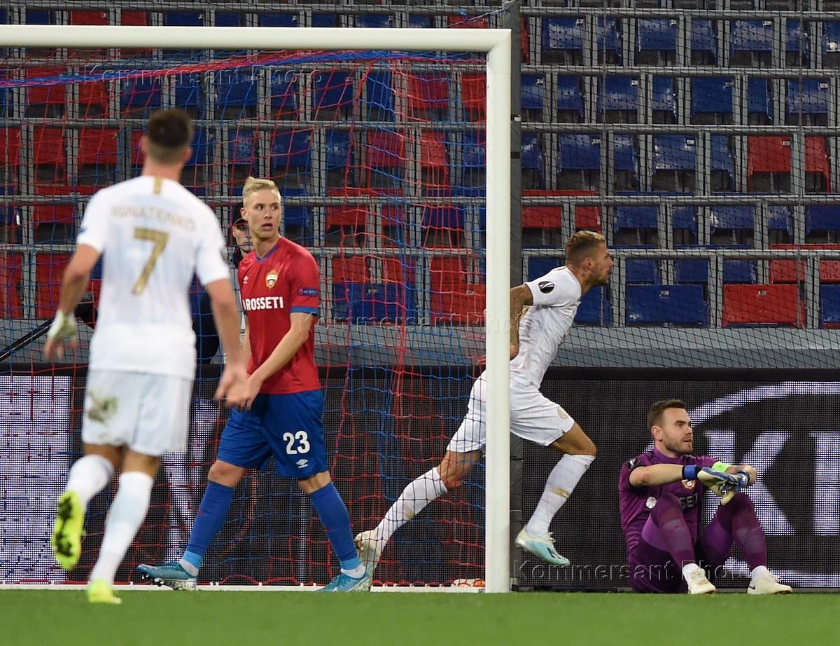 Лига Европы УЕФА. Матч между командами ПФК ЦСКА (Москва, Россия) — "Ференцварош" (Будапешт, Венгрия) на стадионе "ВЭБ Арена". Вратарь команды "Ференцварош" Денеш Дибуш (слева) во время матча.