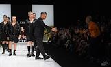 "Неделя моды в Москве. Сделано в России". Показ коллекций сезона весна-лето 2020 в Гостином дворе. Показ новой коллекции модельера Ильи Шияна. Актер Дмитрий Сычев (второй слева), телеведущий Валдис Пельш (третий справа) и модельер Илья Шиян (справа) во время показа.