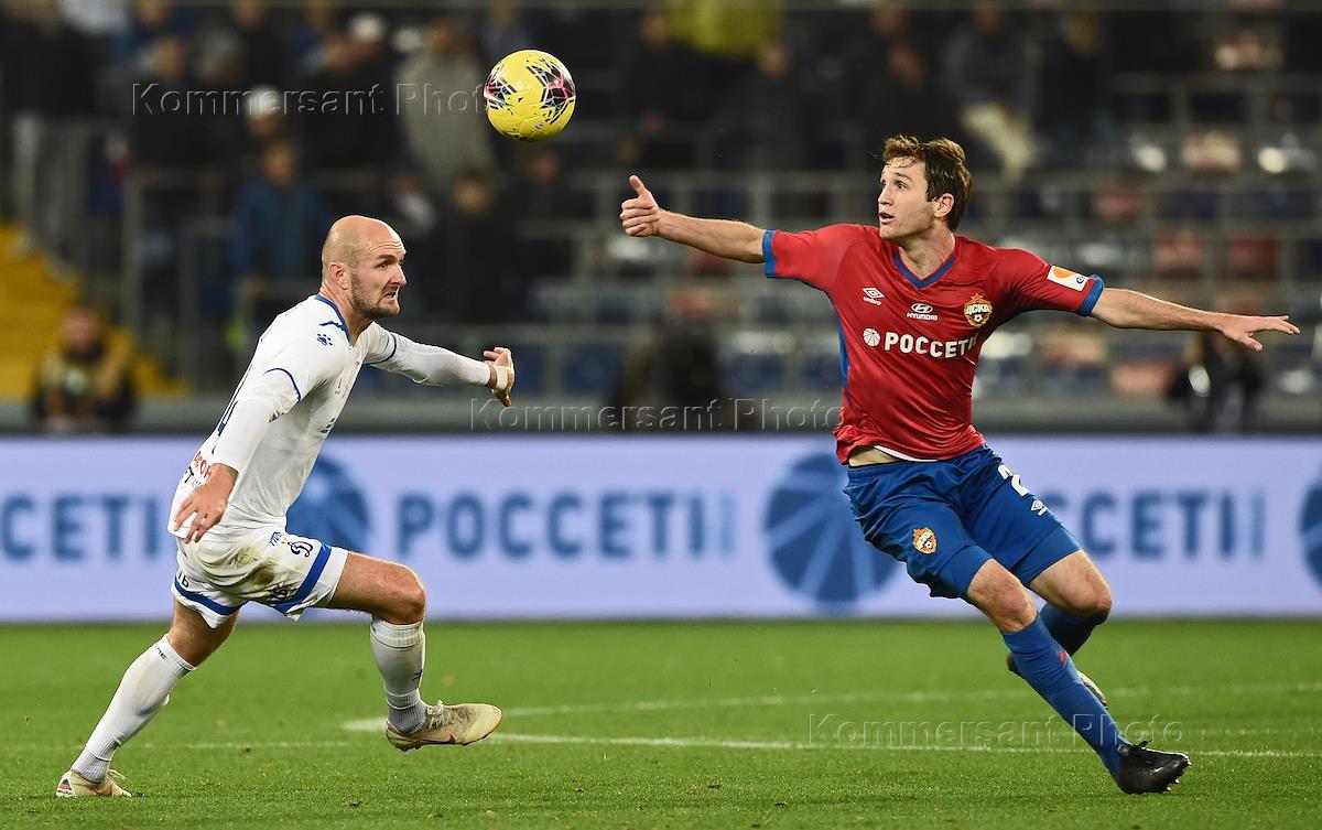 Российская Премьер-лига (РПЛ). Чемпионат России по футболу 2019/2020. 14-й тур. Матч между командами "ЦСКА" (Москва) и "Динамо" (Москва) на стадионе "ВЭБ Арена". Игрок команды "Динамо" Владимир Рыков (в центре) и игрок команды ЦСКА Фёдор Чалов (слева) во время матча.