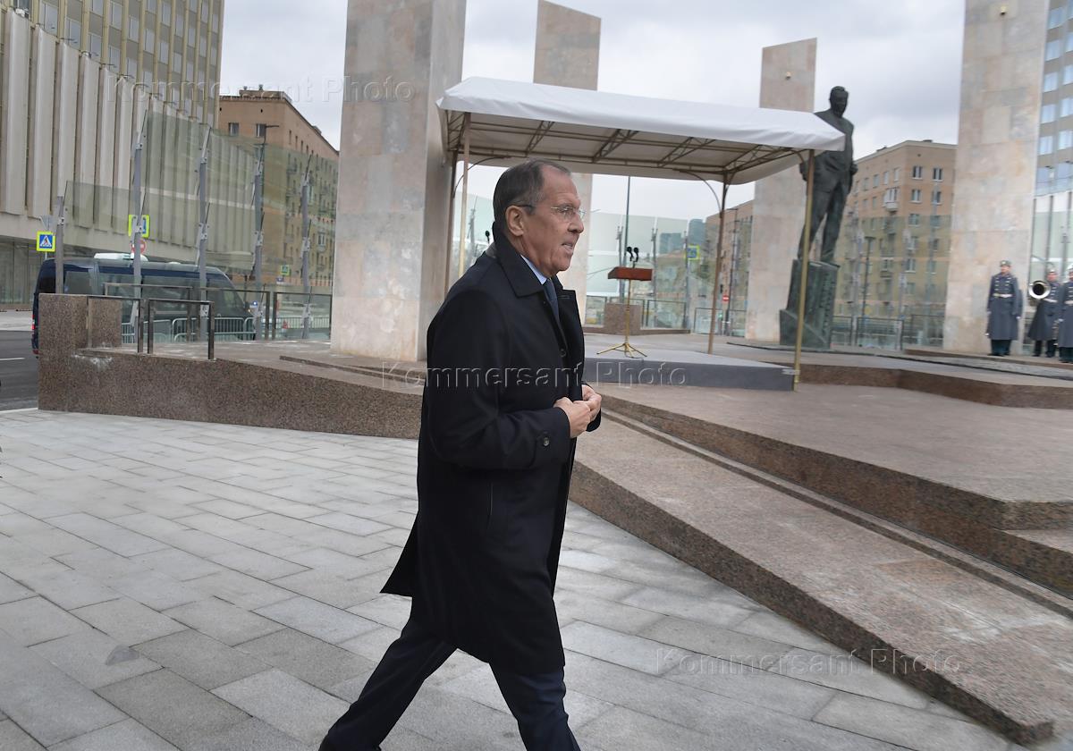 Церемония открытия памятника политику Евгению Примакову в сквере напротив здания Министерства иностранных дел России на Смоленской площади. Министр иностранных дел России Сергей Лавров перед началом церемонии.