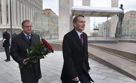 Церемония открытия памятника политику Евгению Примакову в сквере напротив здания Министерства иностранных дел России на Смоленской площади. Сопредседатель Ассоциации юристов России Сергей Степашин (слева) и директор Службы внешней разведки Сергей Нарышкин (справа) перед началом церемонии.