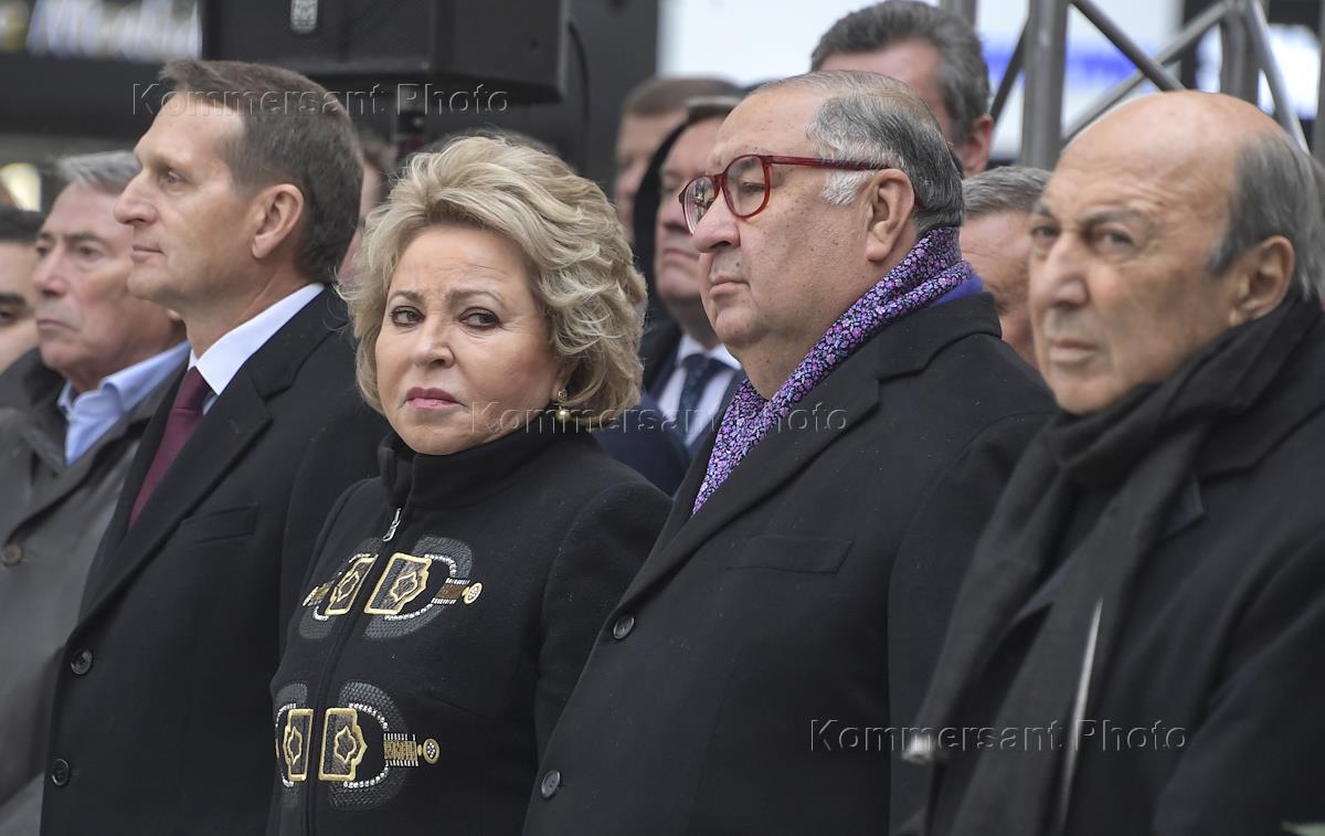 Церемония открытия памятника политику Евгению Примакову в сквере напротив здания Министерства иностранных дел России на Смоленской площади. Справа налево: учредитель USM Holdings Алишер Усманов, мэр Москвы Сергей Собянин и председатель Совета Федерации России Валентина Матвиенко перед началом церемонии.