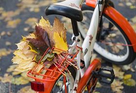 Жанровая фотография. Опавшие осенние листья. Осень. Багажник велосипеда.
