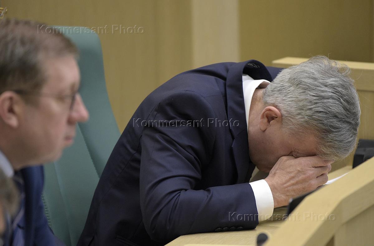 Заседание Совета Федерации (СФ) России. Председатель комитета СФ России по бюджету и финансовым рынкам Николай Журавлев (в центре) во время заседания.