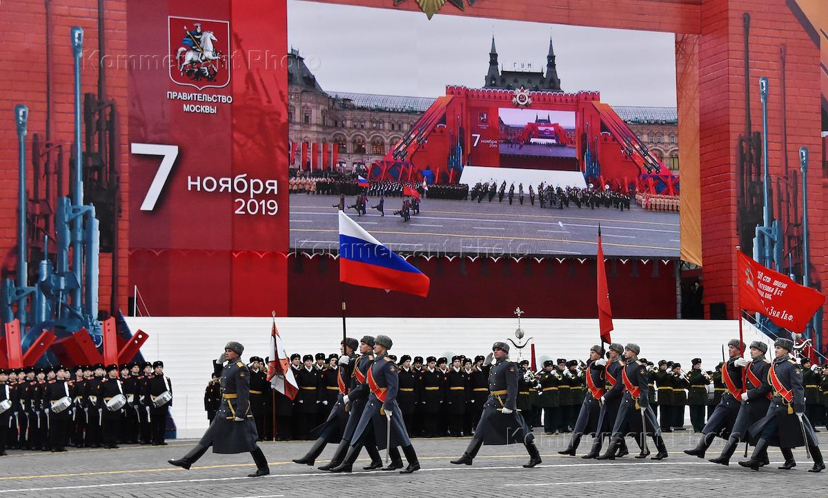 Торжественный марш, посвященный 78-й годовщине военного парада 7 ноября 1941 года, прошел на Красной площади. Участники во время марша.