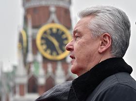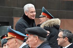 Торжественный марш, посвященный легендарному параду 7 ноября 1941 года на Красной площади. Мэр Москвы Сергей Собянин во время выступления перед началом марша.