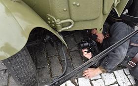 Торжественный марш, посвященный 78-й годовщине военного парада 7 ноября 1941 года, прошел на Красной площади. Жанровая фотография. Фотограф во время съемки деталей военной техники.