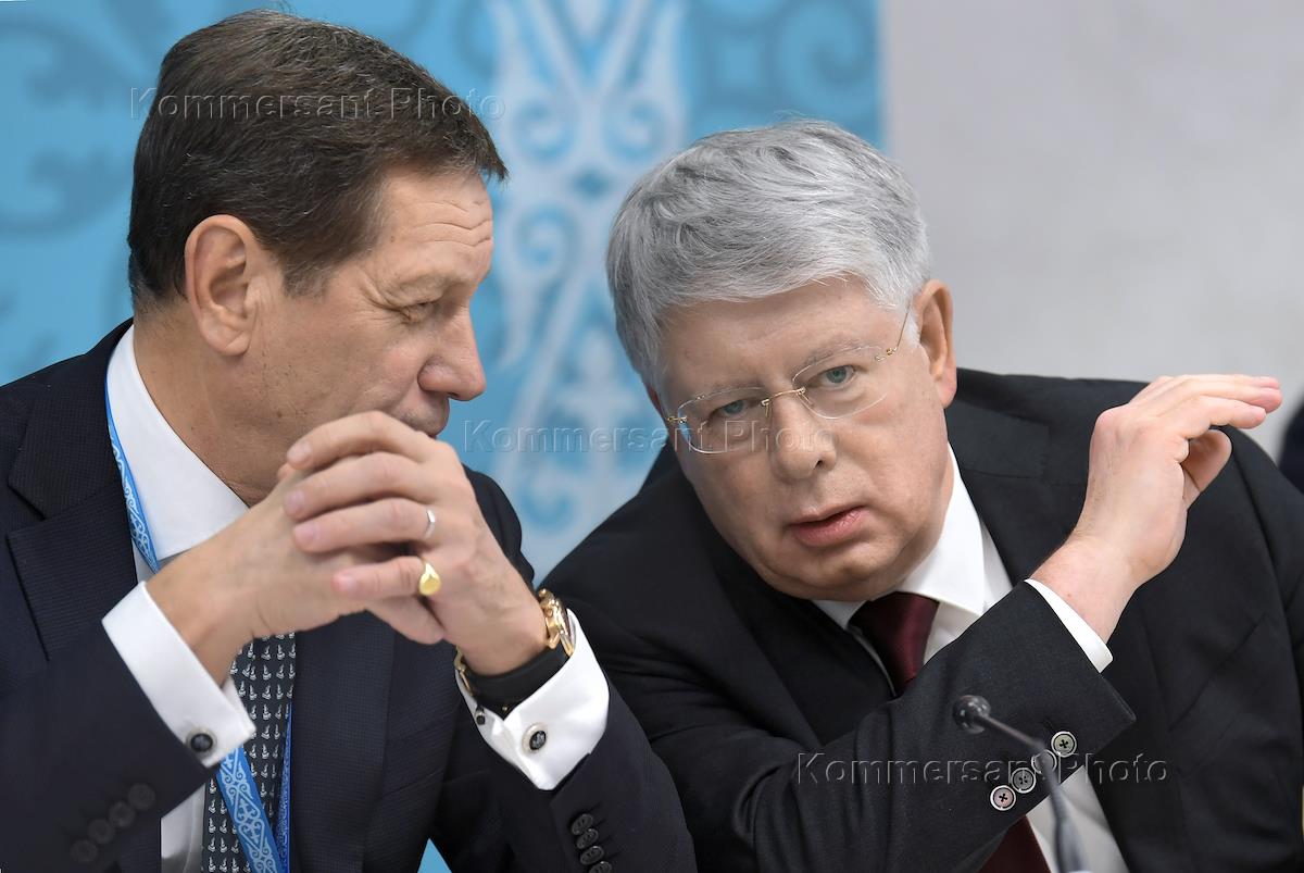 Рабочая поездка Владимира Путина в Омск. XVI Форум межрегионального сотрудничества России и Казахстана. Первый заместитель председателя Государственной думы России Александр Жуков (слева) и посол России в Казахстане Алексей Бородавкин (справа) во время пленарного заседания.