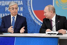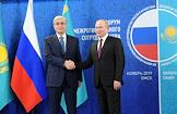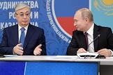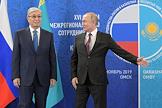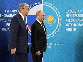 Рабочая поездка Владимира Путина в Сибирский федеральный округ. XVI Форум межрегионального сотрудничества России и Казахстана. Президент Казахстана Касым-Жомарт Токаев (слева) и президент России Владимир Путин (справа) перед началом заседания форума.