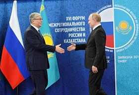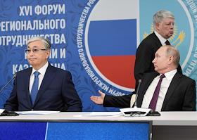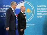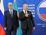 Рабочая поездка Владимира Путина в Омск. XVI Форум межрегионального сотрудничества России и Казахстана. Президент Казахстана Касым-Жомарт Токаев (слева) и президент России Владимир Путин (справа) во время пленарного заседания.