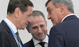 Рабочая поездка Владимира Путина в Омск. XVI Форум межрегионального сотрудничества России и Казахстана. Слева направо: первый заместитель председателя Государственной думы России Александр Жуков, заместитель министра экономического развития России Михаил Бабич и полномочный представитель президента России в Сибирском федеральном округе Сергей Меняйло перед началом пленарного заседания.