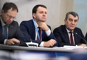 Рабочая поездка Владимира Путина в Омск. XVI Форум межрегионального сотрудничества России и Казахстана. Слева направо: министр культуры России Владимир Мединский, министр экономического развития России Максим Орешкин и полномочный представитель президента России в Сибирском федеральном округе Сергей Меняйло во время пленарного заседания.