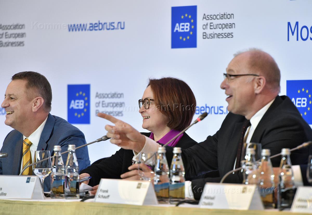 Брифинг председателя Центрального Банка России Эльвиры Набиуллиной в Ассоциации европейского бизнеса (АЕБ) в пресс-центре отеля "Балчуг Кемпински". Слева направо: председатель правления АЕВ, президент компании Schneider Electric по России и СНГ Йохан Вандерплаетсе, председатель Центрального Банка России Эльвира Набиуллина и генеральный директор АЕБ в России Франк Шауфф во время брифинга.