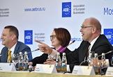 Брифинг председателя Центрального Банка России Эльвиры Набиуллиной в Ассоциации европейского бизнеса (АЕБ) в пресс-центре отеля "Балчуг Кемпински". Слева направо: генеральный директор АЕБ в России Франк Шауфф, председатель правления АЕВ, президент компании Schneider Electric по России и СНГ Йохан Вандерплаетсе и председатель Центрального Банка России Эльвира Набиуллина перед началом брифинга.