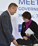Брифинг председателя Центрального Банка России Эльвиры Набиуллиной в Ассоциации европейского бизнеса (АЕБ) в пресс-центре отеля "Балчуг Кемпински". Председатель правления АЕВ, президент компании Schneider Electric по России и СНГ Йохан Вандерплаетсе (слева) и председатель Центрального Банка России Эльвира Набиуллина (справа) во время брифинга.