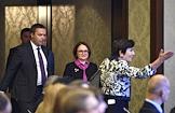 Брифинг председателя Центрального Банка России Эльвиры Набиуллиной в Ассоциации европейского бизнеса (АЕБ) в пресс-центре отеля "Балчуг Кемпински". Председатель Центрального Банка России Эльвира Набиуллина (вторая слева) перед началом брифинга.