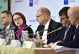 Брифинг председателя Центрального Банка России Эльвиры Набиуллиной в Ассоциации европейского бизнеса (АЕБ) в пресс-центре отеля "Балчуг Кемпински". Слева направо: председатель правления АЕВ, президент компании Schneider Electric по России и СНГ Йохан Вандерплаетсе, председатель Центрального Банка России Эльвира Набиуллина, генеральный директор АЕБ в России Франк Шауфф, генеральный директор АО "ИНГ Банк (Евразия)" Михаил Чайкин и председатель совета НПФ "Райффайзен" Александр Лоренц во время брифинга.