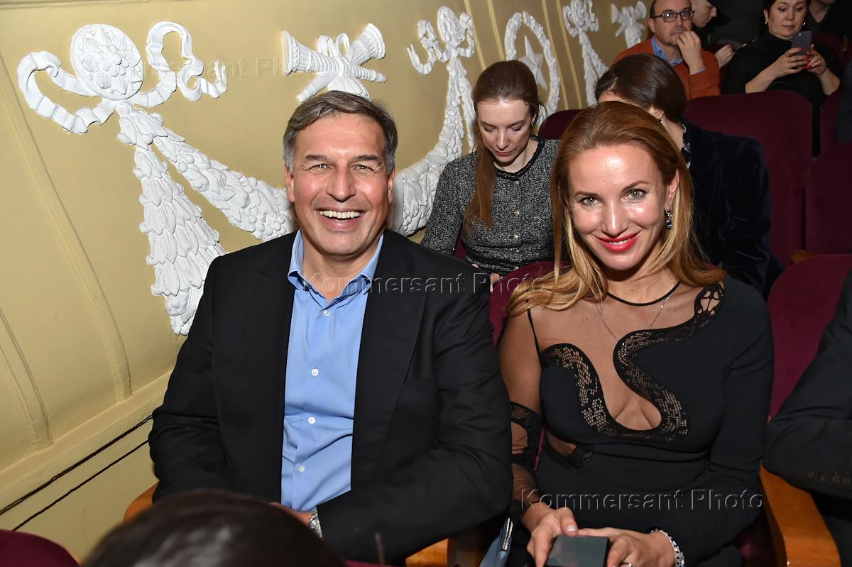 Спектакль "Театра на Малой Бронной" и "Мастерской Брусникина" режиссера Максима Диденко "Норма" по роману Владимира Сорокина в театрально-концертном зале (ТКЗ) "Дворец на Яузе". Руководитель проекта "ВТБ Арена Парк" Андрей Перегудов (слева) и супруга Андрея Перегудова Ольга Мягких (справа) перед началом спектакля.