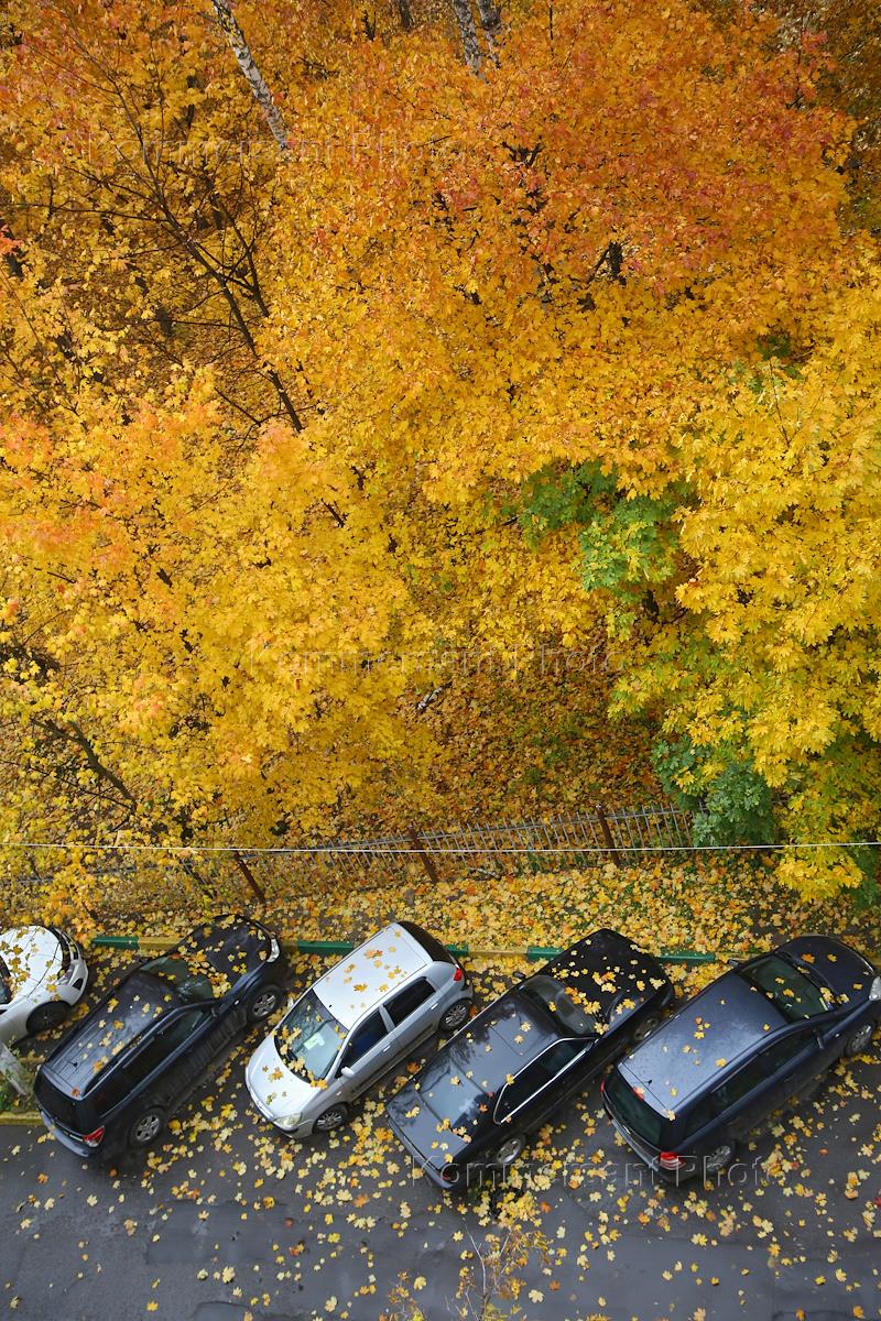 Жанровая фотография. Автомобили на парковке возле дома среди золотой листвы.